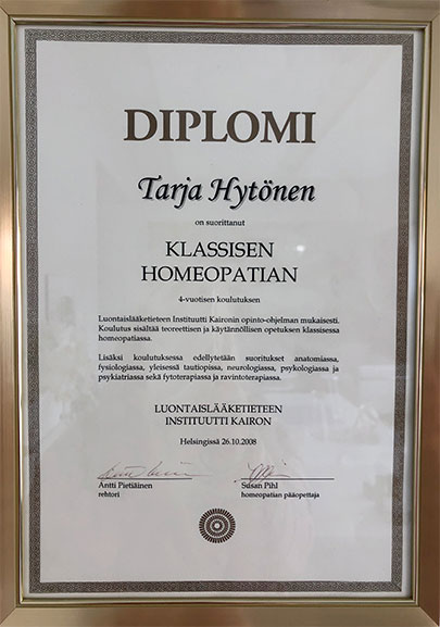 Homeopatialla olen hoitanut 1990 -luvun alusta hyvin tuloksin ja valmistunut syksyllä 2008 klassiseksi diplomihomeopaatiksi.